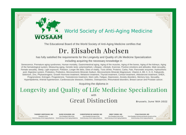 + To get you an official diploma from the World Society of Anti-Aging Medicine (WOSAAM) and its president, Dr. Thierry Hertoghe.